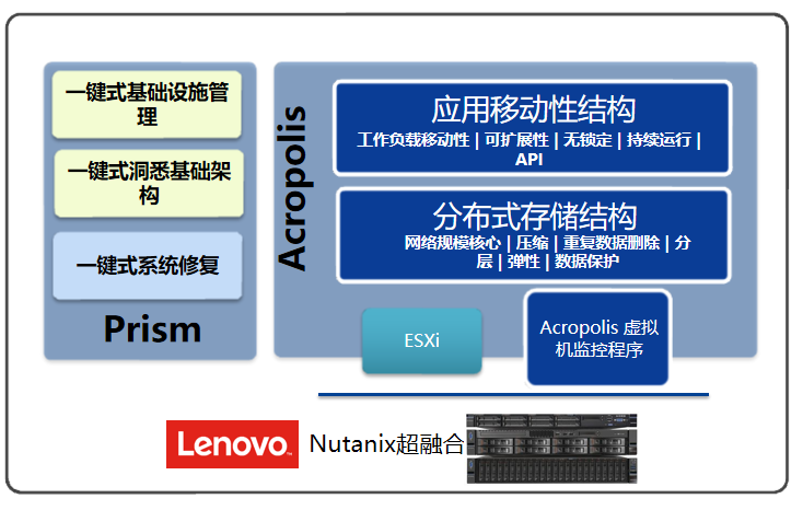 Nutanix超融合支持根据业务发展按需扩容,支持单个节点扩容,支持异构节点扩容,Nutanix超融合支持Vmware和AHV等多种虚拟化平台,并支持异构虚拟化群集容灾;